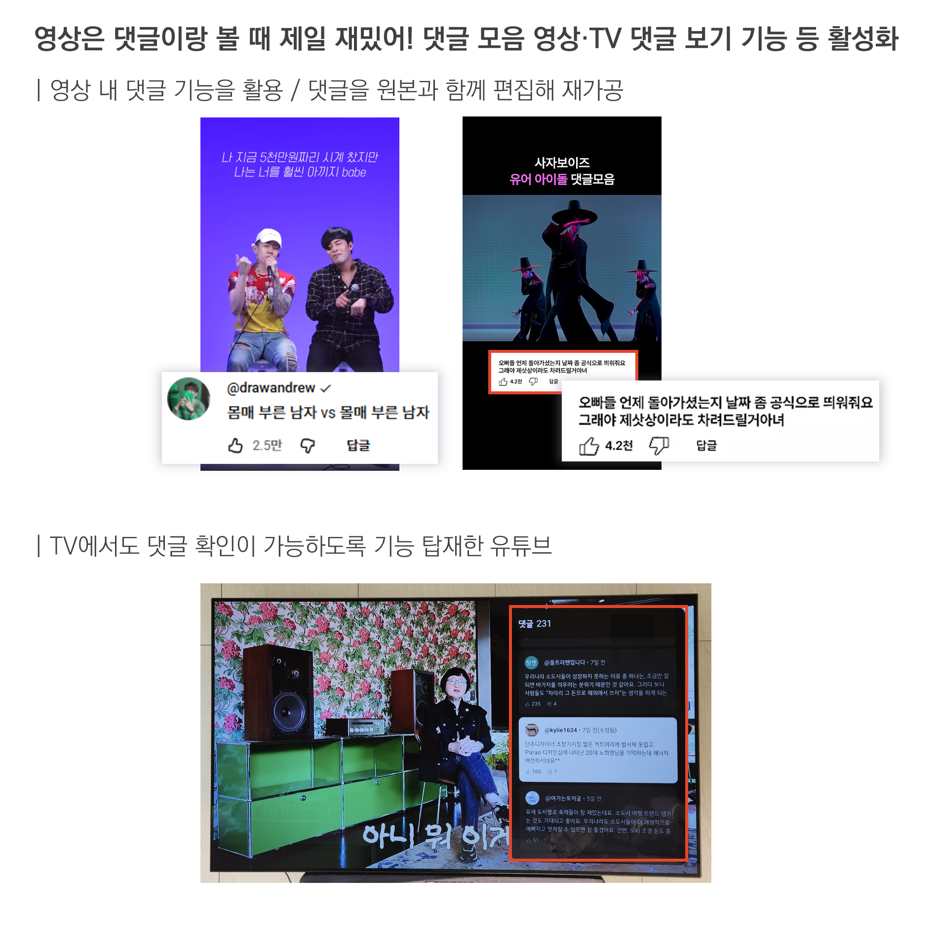 요즘 영상 볼 때 댓글까지 함께 보시는 분들 계시나요? 재밌는 영상이나 논란이 될 것 같은 영상을 보면 얼마나 웃긴 댓글이 달렸을지, 다른 사람들은 어떤 생각을 하고 있는지가 궁금해서 영상이 채 끝나기도 전에 댓글 창을 켜서 살펴보는 경우가 많은데요. 이렇듯 이제 댓글은 그냥 단순한 반응이 아니라 또 하나의 콘텐츠가 됐어요. 댓글에도 좋아요 표시나 대댓글을 통해 주목을 받을 수 있다보니, 누가 더 재치있게 댓글을 다나 경쟁이 붙기도 하고, 아예 웃긴 댓글을 모아 새 영상으로 엮는 등 댓글을 활용해 2차 창작도 즐기고 있어요. 진작에 유튜브는 TV로 볼 때도 댓글을 함께 띄워주는 기능까지 넣었어요. 이제 영상만 보는 게 아니라, 댓글까지 함께 보는 경험이 트렌드가 된 셈이에요.
