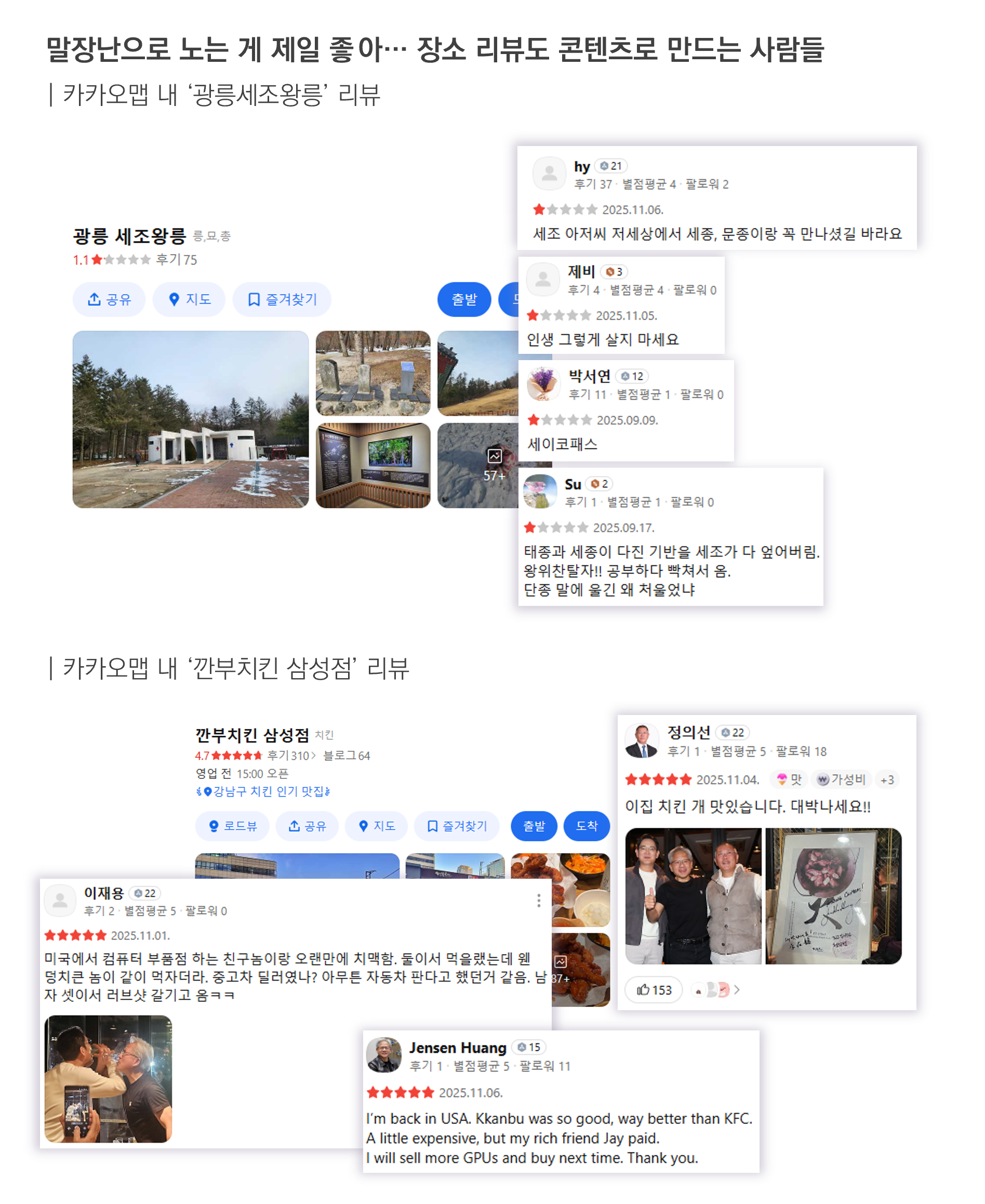 이 댓글 놀이 문화가 최근에는 지도 앱의 리뷰 탭에서도 보이고 있어요. 카카오맵 ‘광릉세조왕릉’ 리뷰에는 역사적 사실에 기반한 풍자 댓글이 달리고, '깐부치킨 삼성점' 리뷰에는 마치 본인이 젠슨황, 이재용, 정의선 총수인 양 리뷰를 남기거나, 세 총수가 왔다간 기운을 받고자 해당 리뷰 칸에 본인의 소원을 비는 리뷰들이 달리고 있어요. 장소 리뷰가 더 이상 '맛있어요', '친절해요'와 같은 장소 평가에 그치지 않고, 사람들의 유머와 밈이 오가는 놀이터가 됐어요. 이제 장소 리뷰도 단순히 정보를 확인하는 기능을 넘어, 모두가 함께 웃는 하나의 콘텐츠 공간으로 진화하고 있어요.