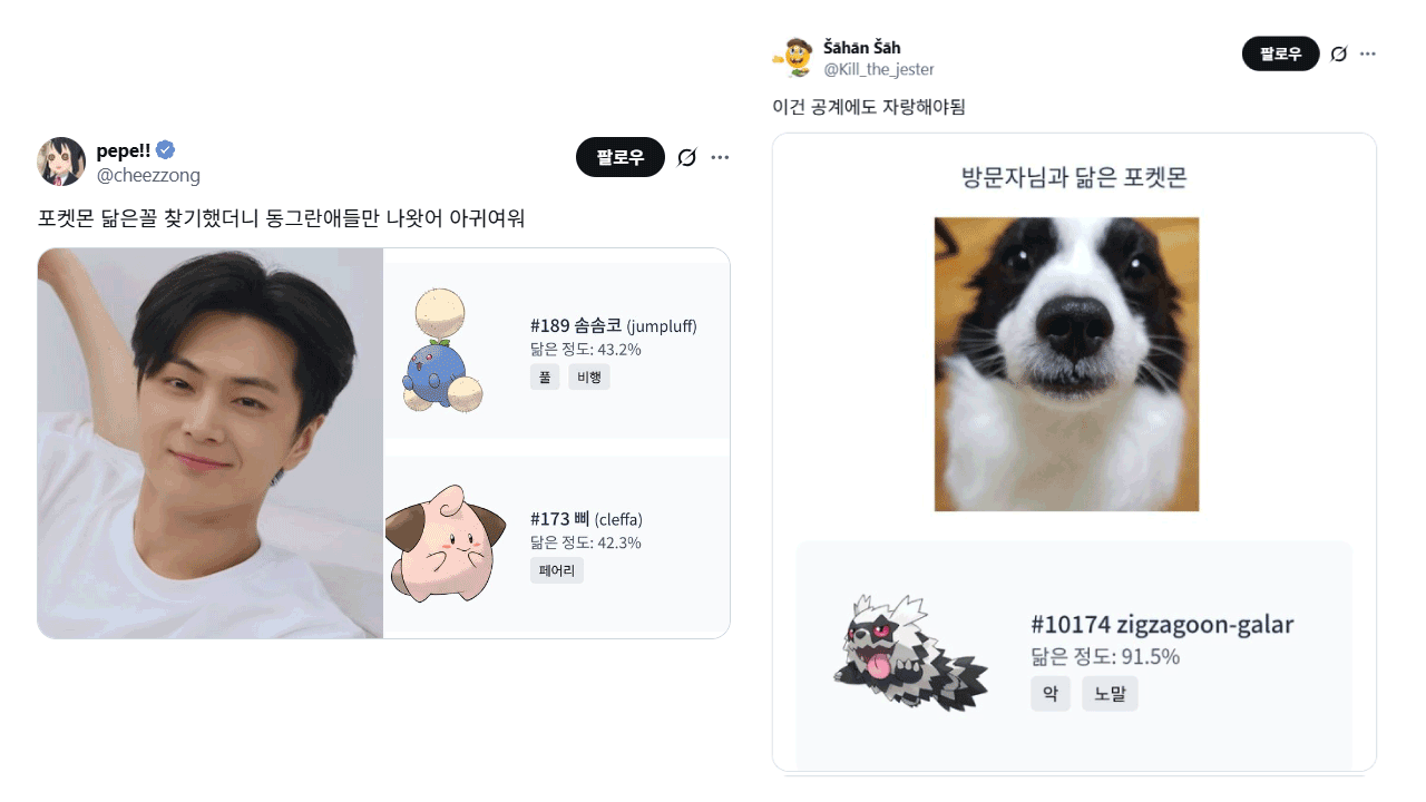 최근 X(구 트위터)에서는 사진만 업로드하면 AI가 닮은 포켓몬을 찾아주는 ‘닮은 포켓몬 찾기’ 사이트가 화제예요. 11월 19일 오전 기준 1,554만 회에 달할 정도로 뜨거운 반응을 얻고 있어요. 이 사이트가 특히 인기를 끄는 이유는 X 특유의 놀이 문화와 잘 맞아떨어졌기 때문인데요. 이용자들은 좋아하는 연예인, 캐릭터, 반려동물 등 각자의 ‘최애’를 넣어보며 결과를 공유하고, 서로 반응을 주고받는 방식으로 즐기고 있어요.