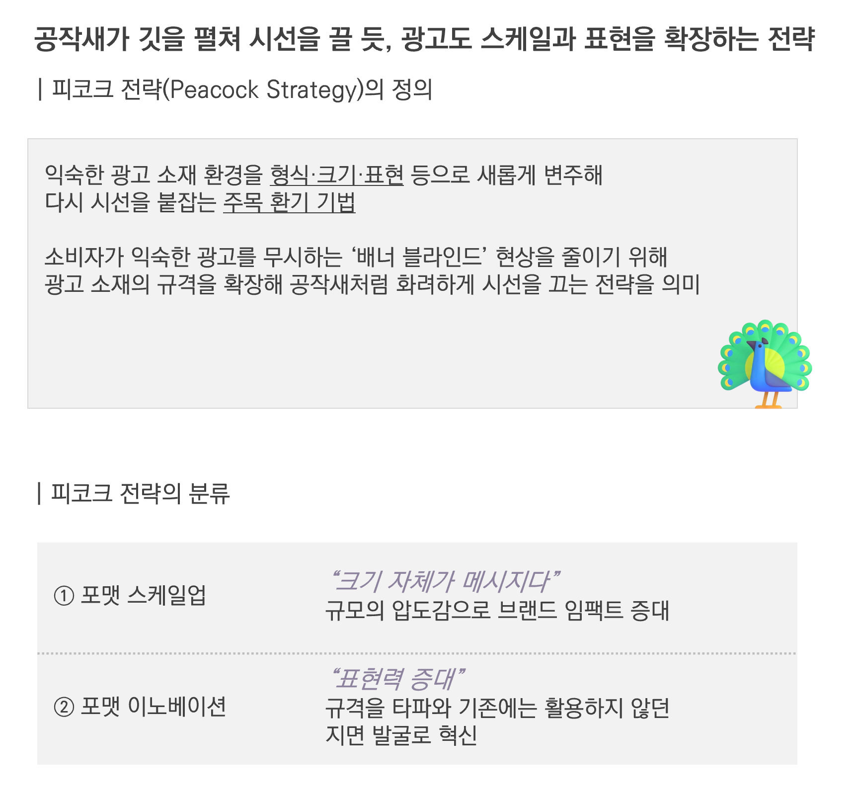 광고 노출에 대해 너무 익숙해지면서 소비자들이 광고를 무의식적으로 흘려보내는 ‘배너 블라인드’ 현상이 두드러지고 있어요. 이로 인해 광고 주목도가 낮아지면서 매체들은 경쟁력을 확보하기 위해 '피코크 전략'을 활용하고 있어요.