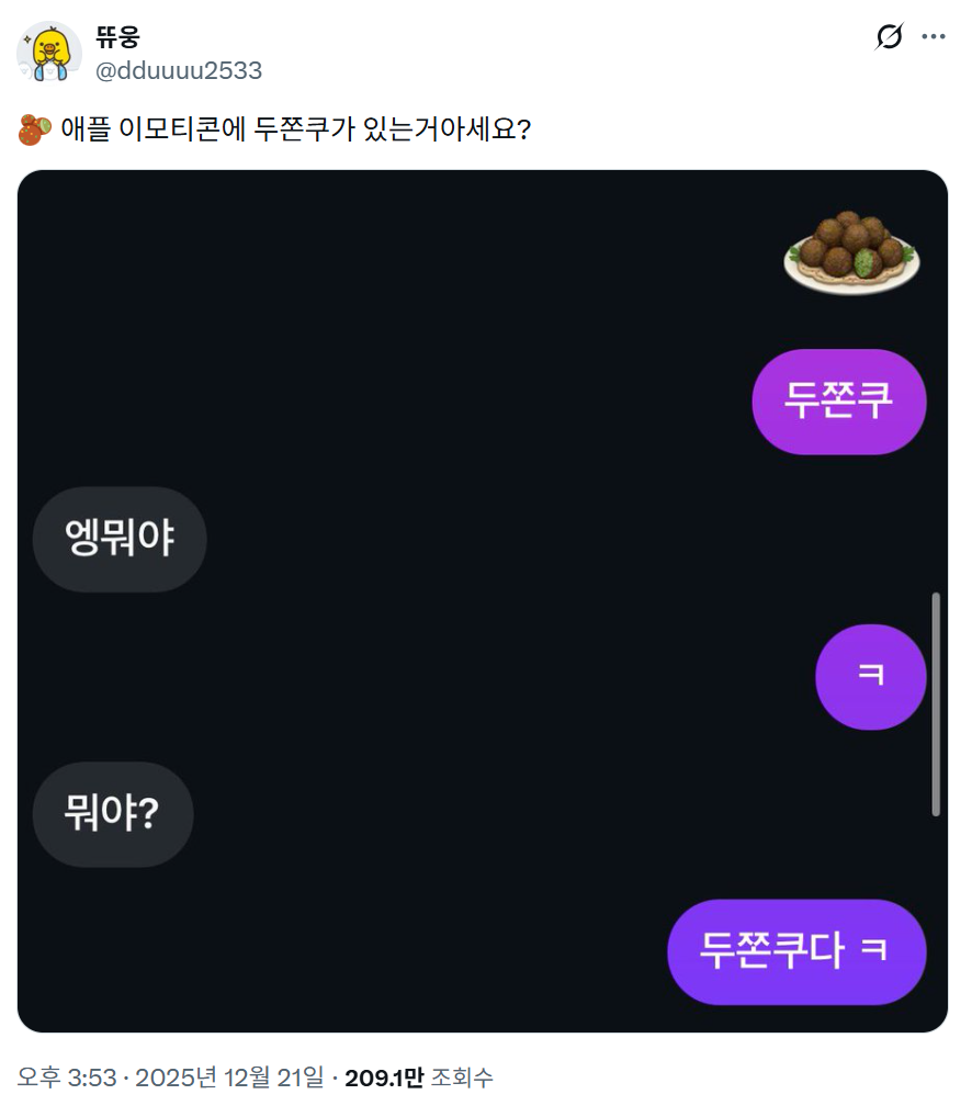 🧆두쫀쿠 임티로 오해받은 음식까지 이런 인기에 힘입어 심지어 X에서는 ‘애플 이모티콘에 두쫀쿠가 있다’는 이야기가 퍼지기도 했어요. 해당 이모티콘은 실제로는 팔라펠이라는 중동음식인데요. 해당 게시글이 퍼진 이후 각종 아이돌 버블에서 자신의 트렌디함(?)을 보여주고자 이를 팬들에게 알려주는 아이돌들이 늘었다는 후기도 보여요. 이렇게 전국적으로 ‘트렌드 음식’의 상징이 되며 폭발적인 인기를 끌고 있는 두쫀쿠. 앞으로도 그 인기가 이어지며 스테디화에 성공할지 지켜볼 필요가 있어 보여요. |