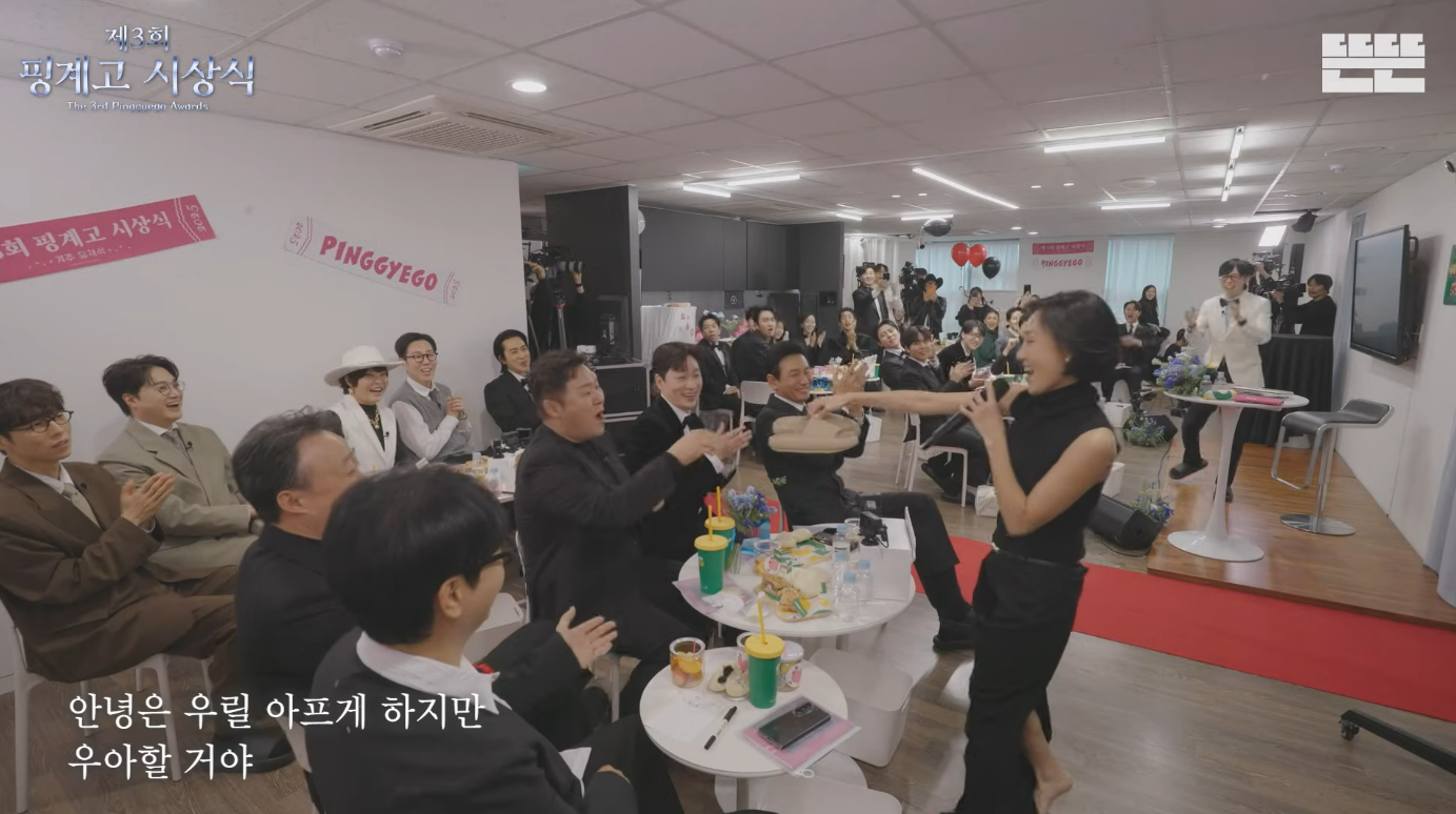 시상식에 축하 무대가 빠질 수 없지: 시상식에 빠질 수 없는 순서인 축하 무대도 진행했어요. 청룡영화상에서 한 편의 영화 같은 무대를 선보였던 화사가 또 한 번 ‘Good Goodbye’ 공연을 했어요. 핑계고 시상식에서는 박정민 역할로 윤경호가 맡았어요. 윤경호는 청룡영화상에서 화사의 무대를 아련하게 쳐다보며 과몰입한 모습이 찍혀서 SNS에서 화제였는데요. 화사가 슬리퍼를 벗어 윤경호에게 건네주자 감격에 겨운 성덕의 모습을 보여줬어요.