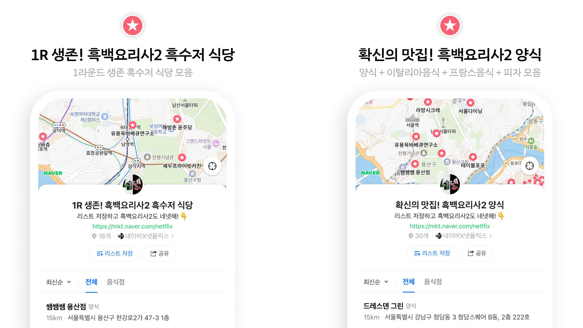 🗺️ 셰프의 식당이 궁금해! 네이버 지도가 알려줌 네이버는 네이버 지도 등 주요 서비스를 연계한 이벤트를 진행했어요. 네이버 지도 앱의 ‘저장 리스트’를 통해 프로그램에 출연한 셰프들의 식당을 한눈에 확인할 수 있게 한 건데요. 먼저 지난 5일, 시즌 2 공개에 앞서 1차 리스트를 선공개했어요. 리스트에는 손종원, 레이먼킴 등 약 30명의 유명 셰프가 운영하는 정보가 들어가 있었어요. (사람 몰리기 전에 미리 공개한 네이버 지도 완전 감.다.살 👏) 방송이 시작된 직후인 18일부터는 시즌 2 출연진의 전체 식당 리스트를 업데이트해 공개했어요. 덕분에 시청자들은 출연 셰프의 식당을 일일이 찾아봐야 하는 번거로움을 덜 수 있게 됐어요