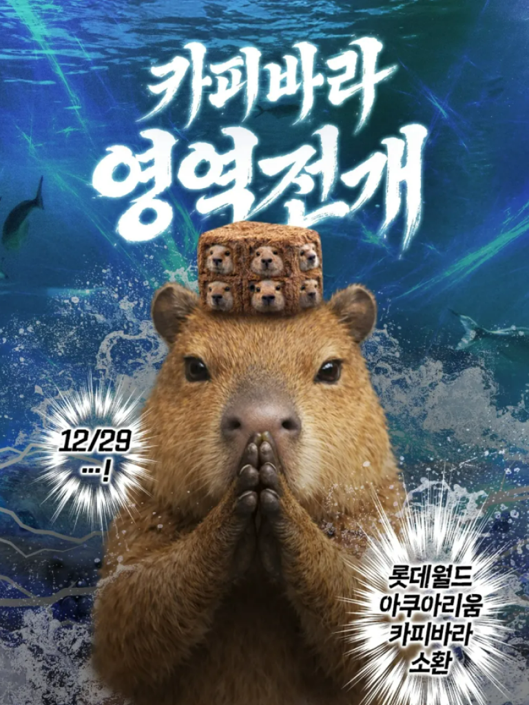 동글한 몸에 멍한 표정으로 존재만으로도 귀여운 카피바라가 롯데월드 아쿠아리움의 새 식구가 되었어요. 온순한 성격으로 잘 알려진 카피바라는 12월 29일부터 롯데월드 아쿠아리움 지하 1층에 마련된 카피바라 수조에서 직접 만날 수 있어요. 수조 공개와 함께 먹이 주기 프로그램과 관찰 중심 콘텐츠로 구성된 신규 생태설명회도 진행될 예정이에요. 또한 카피바라의 이름을 정하는 이벤트도 진행 중인데요. 1월 4일까지 참여할 수 있으니, 카피바라에게 이름을 선물할 수 있는 기회도 놓치지 마세요!