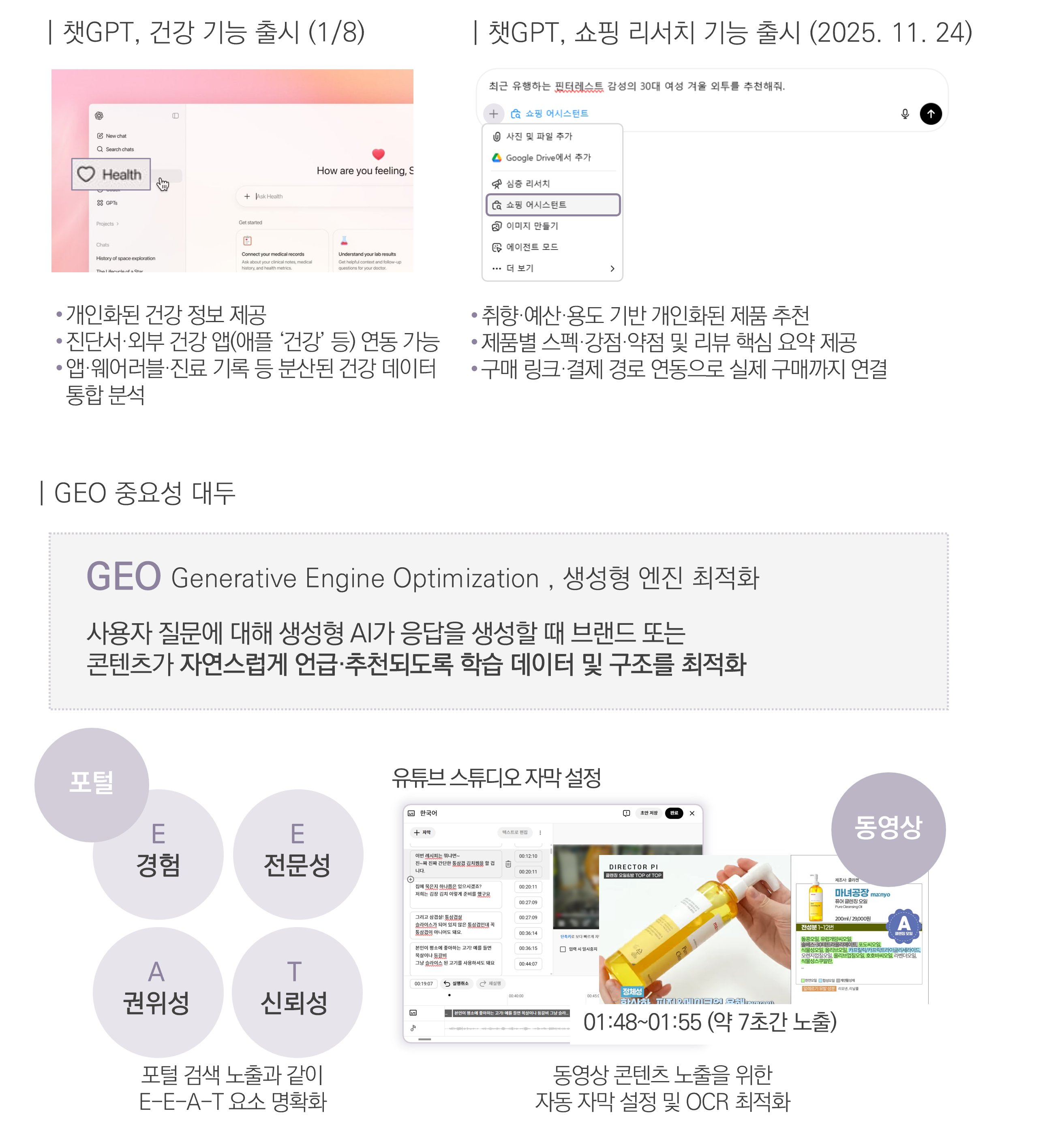 오픈AI는 챗GPT에 쏟아지는 다양한 질문 흐름을 반영해 쇼핑 리서치 기능에 이어, 바로 어제(1/8) 건강 기능까지 추가했어요. 과거 포털과 동영상 플랫폼이 정보 탐색 채널에서 출발해 커머스 기능을 확장해온 것처럼, 챗GPT 역시 단순 정보 탐색을 넘어 구매·행동까지 연결해주거나, 건강 지식과 같은 전문적인 의사결정을 돕는 응답 기능을 강화하고 있어요. 이로 인해 생성형 AI의 응답 내 노출을 목표로 한 GEO(Generative Engine Optimization, 생성형 엔진 최적화)의 중요성도 빠르게 커지고 있어요. 기존 SEO에서 강조돼 온 신뢰도·전문성·경험(E-E-A-T) 기반 데이터 구조화가 GEO의 핵심 요소로 재조명되고 있고, 최근에는 이미지·영상 맥락까지 고려하는 V-GEO 전략이 새로운 경쟁 요소로 부상하는 중이에요. 앞으로 챗GPT와 같은 서비스들은 정보 탐색 채널로 크게 성장할 것으로 보여요.