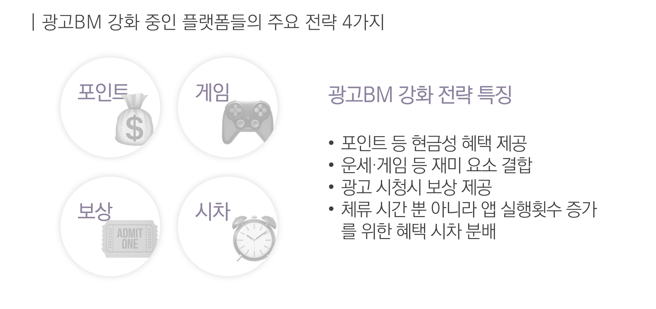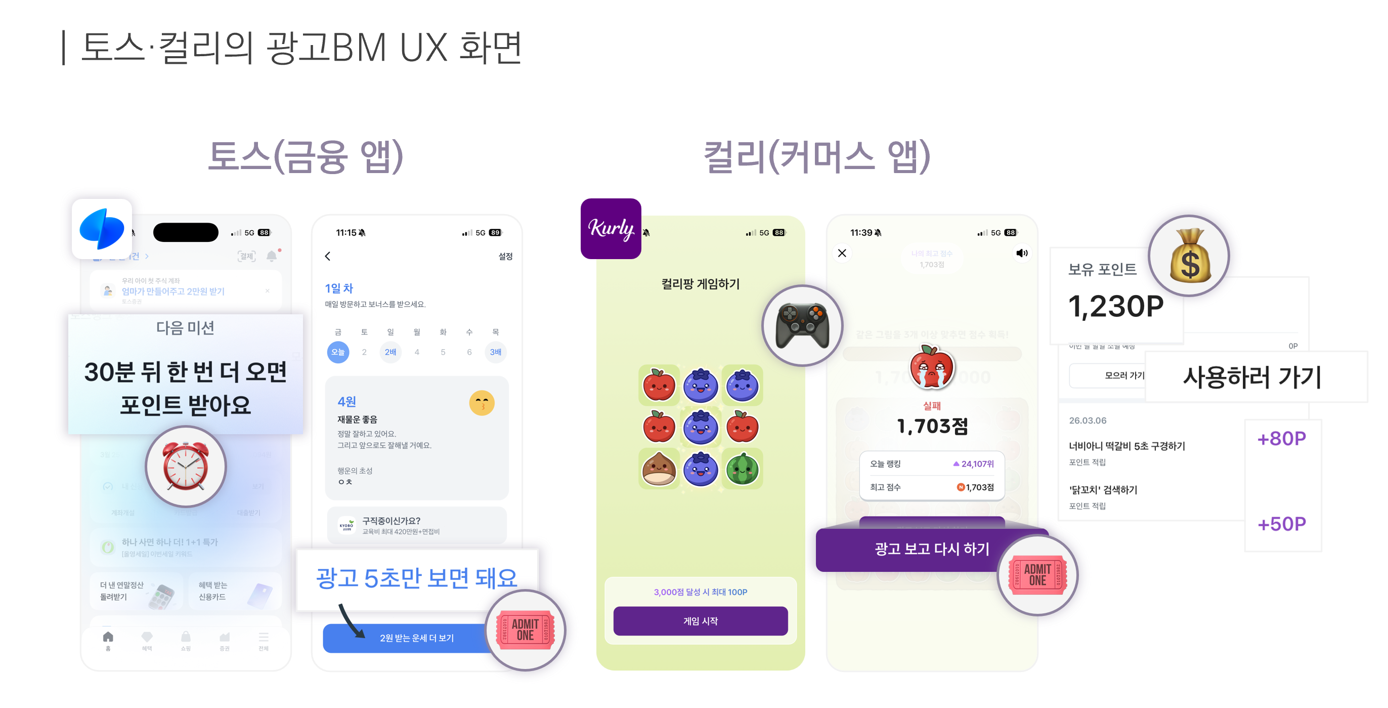 대표적으로 토스는 광고 시청을 하면 기존 받던 혜택보다 더 받을 수 있는 기회(보상)를 제공하고, 혜택 지급에 시차를 두어 사용자의 반복 방문을 유도하고 있어요. 단순 체류시간 증대 뿐 아니라 앱 실행횟수 증가 효과도 누릴 수 있도록 한 점이 포인트예요. 컬리 역시 미니게임 참여와 포인트 보상을 결합해 이용자가 재미를 느끼며 직접적인 혜택을 얻도록 설계하면서도 자연스럽게 광고 노출과 참여를 연결하는 구조를 구축했어요. 이처럼 최근 플랫폼의 광고 BM은 포인트·게임·보상·시차 구조를 결합해 사용자 체류와 재방문을 유도하는 방향으로 고도화되는 흐름을 보이고 있어요.